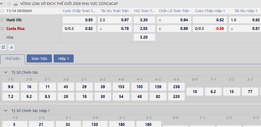 Biến động tỷ lệ kèo Haiti vs Costa Rica