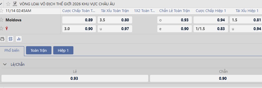 Soi kèo Moldova vs Italia hôm nay ở Vòng loại World Cup ngày 14/11/2025. Tỷ lệ thắng kèo của Italia không khả quan, nên kèo chấp sâu không dễ với cửa trên.