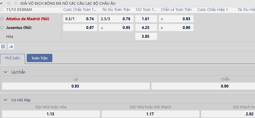 Biến động tỷ lệ kèo Nữ Atletico Madrid vs Nữ Juventus