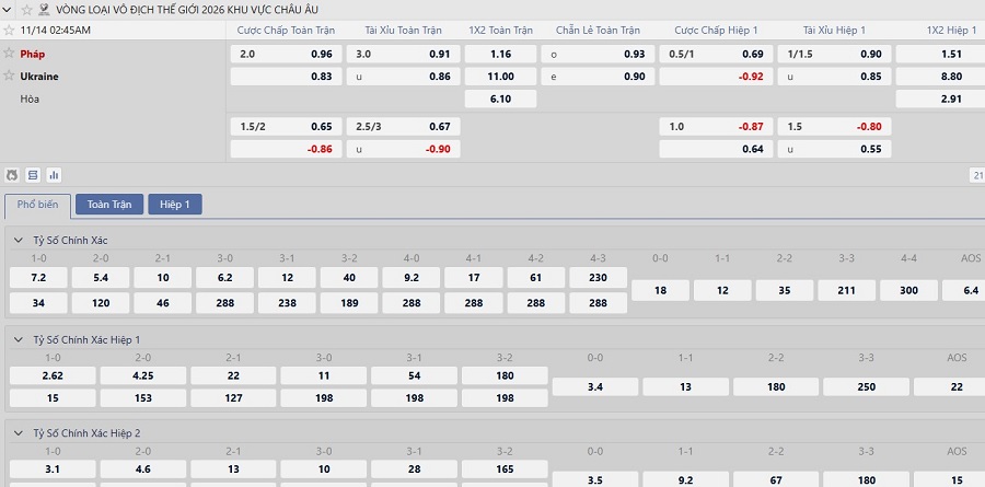 Biến động tỷ lệ kèo Pháp vs Ukraine
