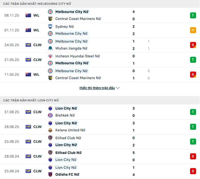 Nữ Melbourne City đụng độ Nữ Lion City Sailors vào lúc 15h00 ngày 13/11/2025, tại sân vận động Thống Nhất - Việt Nam, trong khuôn khổ lượt trận thứ nhất vòng bảng Cup nữ C1 châu Á.