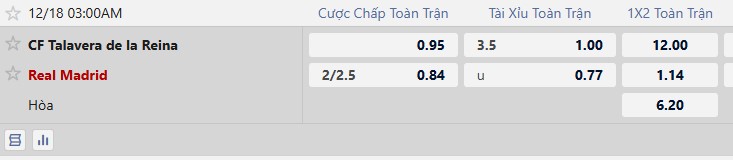 Biến động tỷ lệ kèo Talavera de la Reina vs Real Madrid